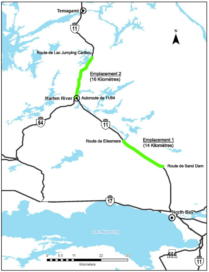 - La province a déterminé deux sites potentiels pour le projet de route 2+1. Les deux sites seront évalués, mais la priorité sera donnée à la conception et à l’évaluation environnementale de la route 11, entre le chemin Sand Dam et le chemin Ellesmere (14 kilomètres).